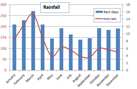 Most rain days in a month | 24 | December 2020, March 2022 |